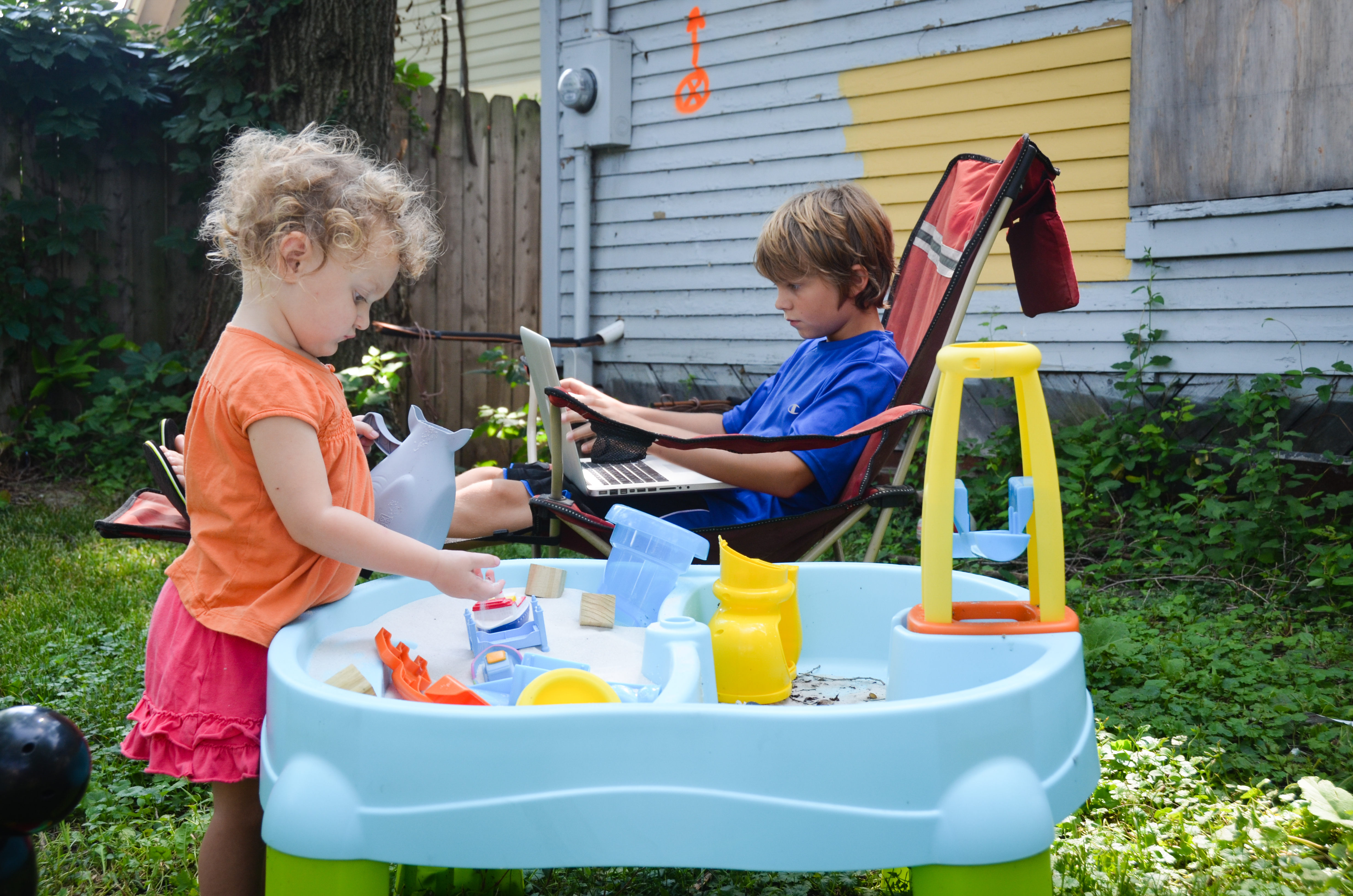 What is actually happening is they are sitting on the only soft and un-mosquito laden surface around (the backseat of the car) and watching a movie on the laptop. No, the doors are not locked. The windows are rolled down and they are not overheating in there. Usually this is early in the morning when the weather is nice. When the mosquitoes aren’t bad Lucy can also play in her sand table or Aiden will begrudgingly kick a ball with her around the yard.