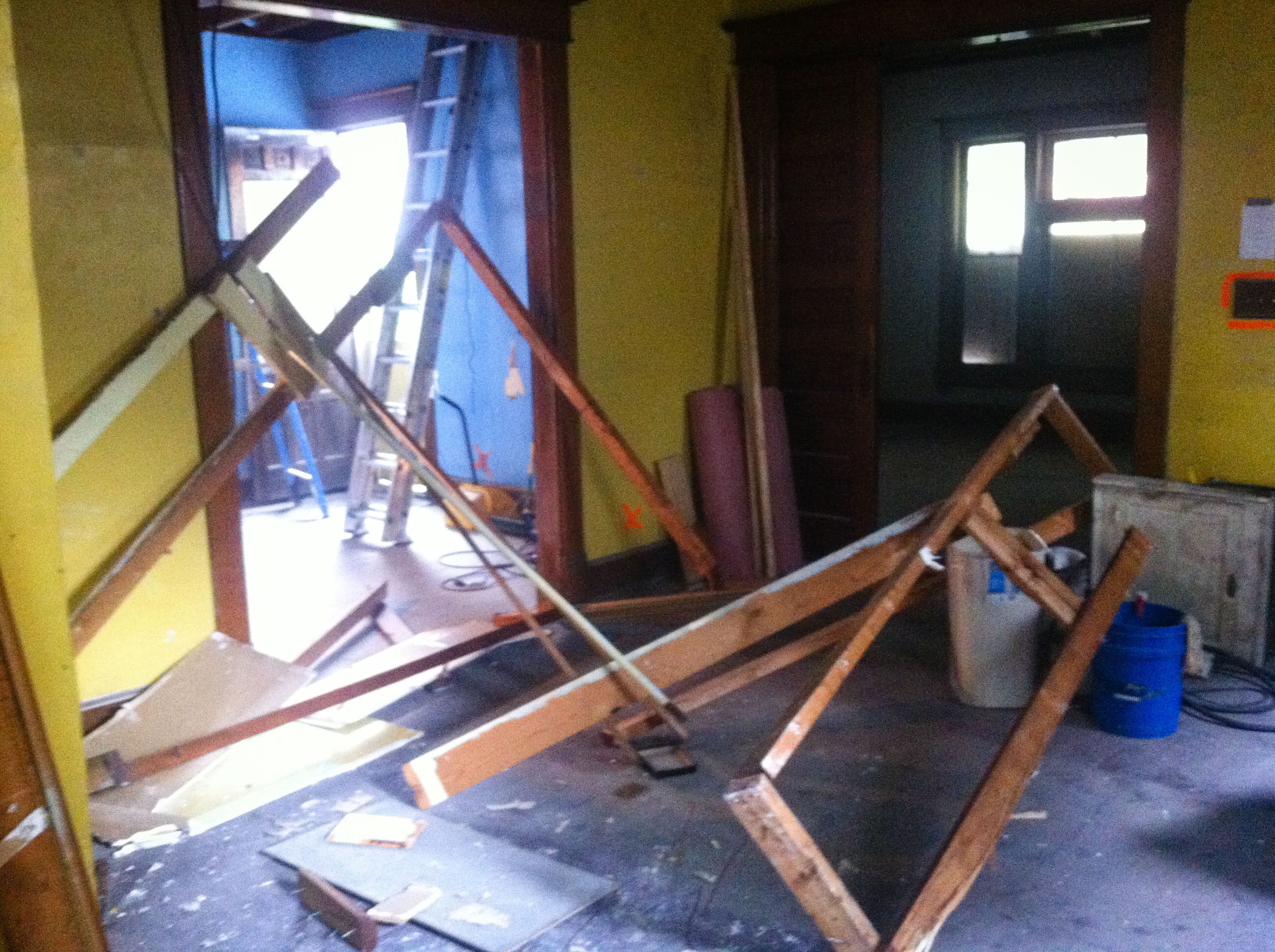 This was the easiest demo project yet. [Edit from Amy: which just proves you weren’t around to witness the ninja kick wall.] I managed to bring it down with just a hammer and my bare hands. [Edit from Amy: Show off.]