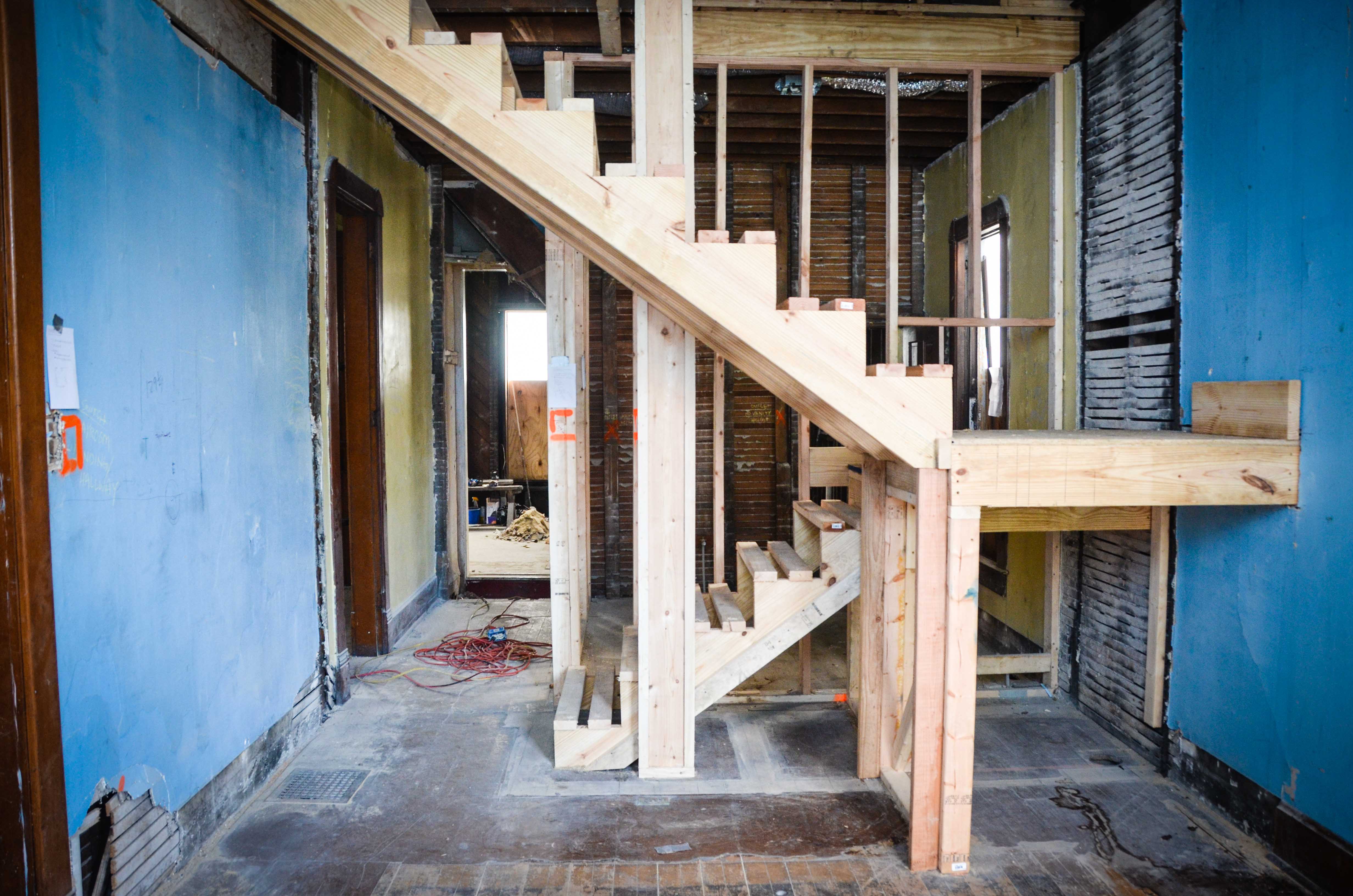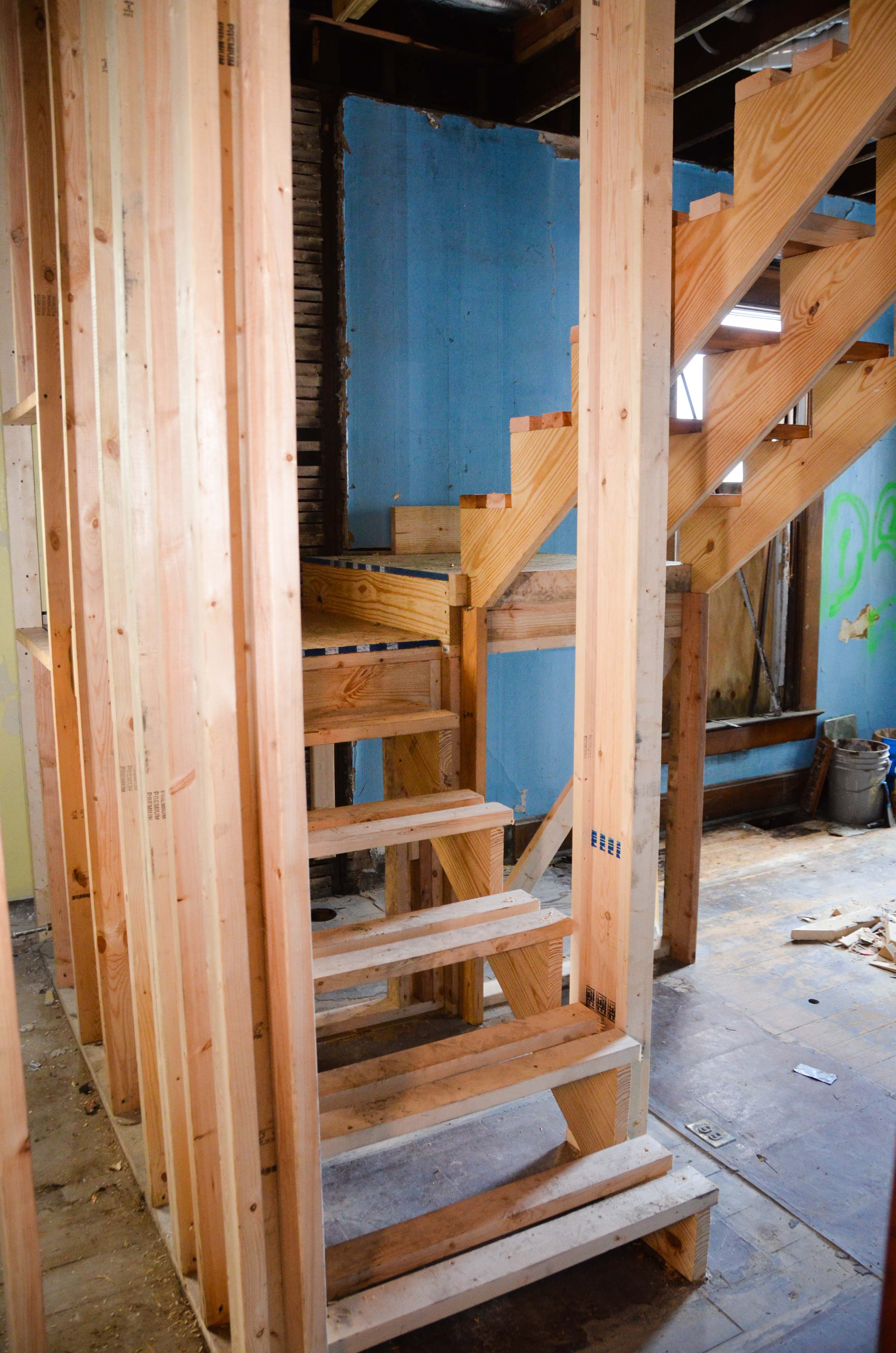 Amid the slow-paced progress of this fall we have managed to arrive at another small milestone. Our new stairs are framed in and now provide a new, functional way to get to the 2nd floor. [Edit from Amy: I’ve been imagining what the house will eventually be in my mind so much. It’s very satisfying to see a large missing element from my daydreams begin to materialize. I’ve imagined the walking up in this location so much that I sometimes walked to this location to walk upstairs only to realize there weren’t any stairs there. Duh.]