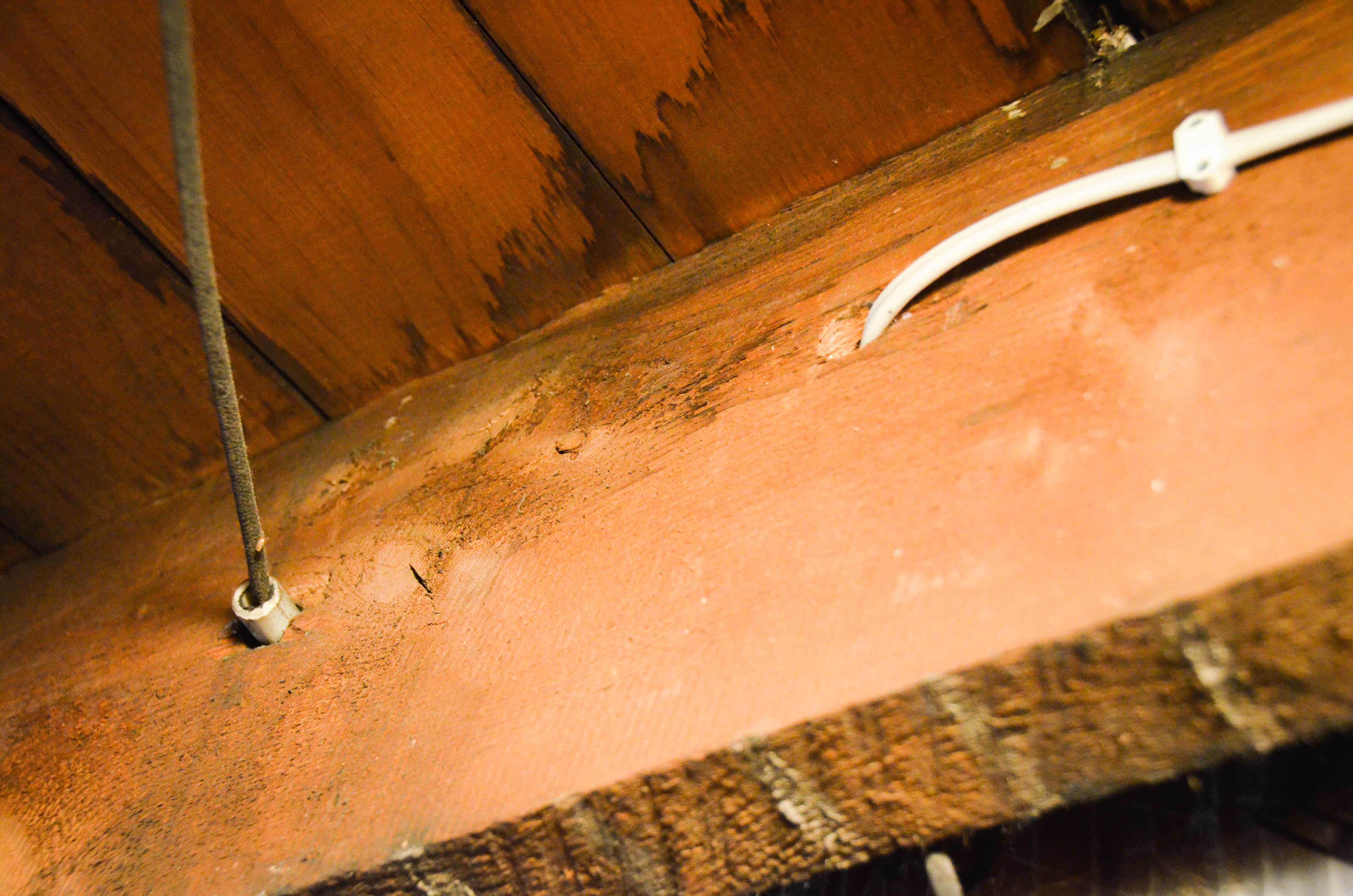 Adjacent to the kitchen is the porch. In order to run cable down to this future fixture I fed my cable from an existing switch box in the kitchen and threaded it down into the existing hole above the porch. This seemingly simple task required wiggling my body like a snake through a laughably small hole in a closet on the second story and into this area to gain access to the porch overhead. Fun.