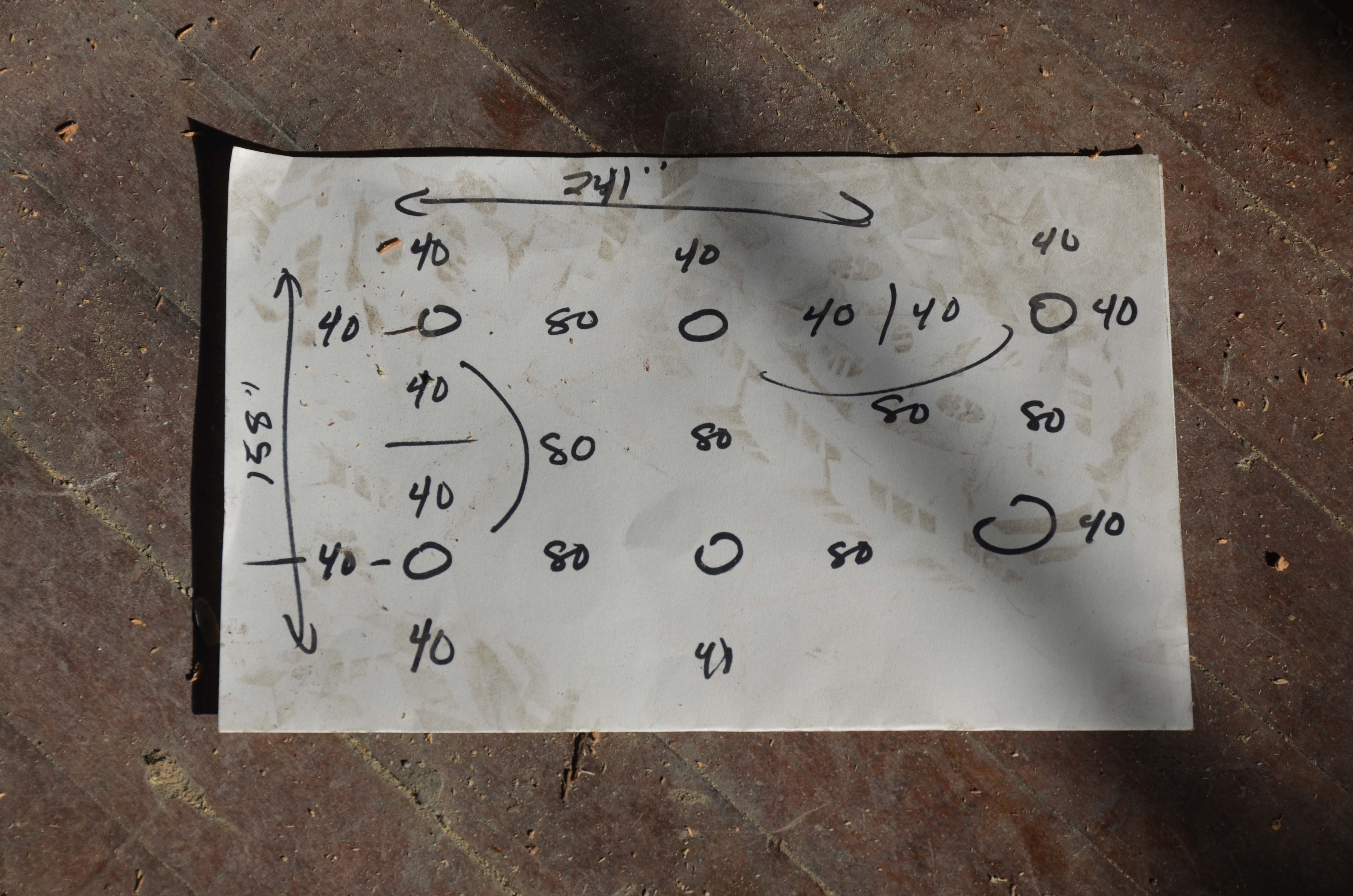 Here is a picture sketching out my plan for spacing out the ambient lighting in the kitchen. The lights will be 40 inches from the wall and 80 inches from one another.