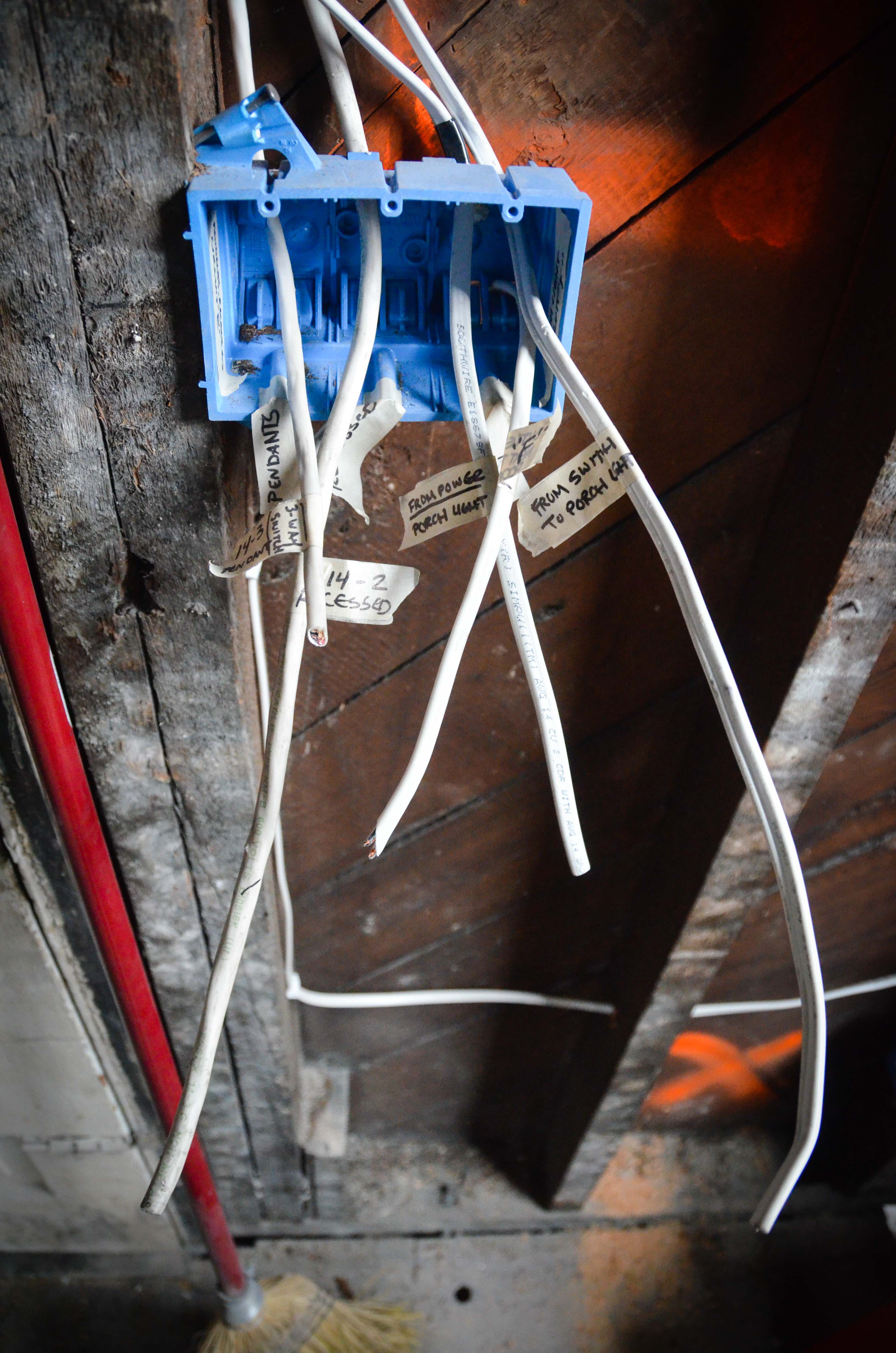 We do not have any ceilings downstairs. This means that running cable overhead from a switch on a wall to a ceiling fixture was easy (but still time consuming) work. It was especially easy to run cable where there happened to be old knob and tube wiring because I could strip out the old work and use the existing holes. Drilling new holes is not super difficult but it is a little tiring once you’ve done a dozen over your head on top of a ladder. I always tried to use existing holes if possible.