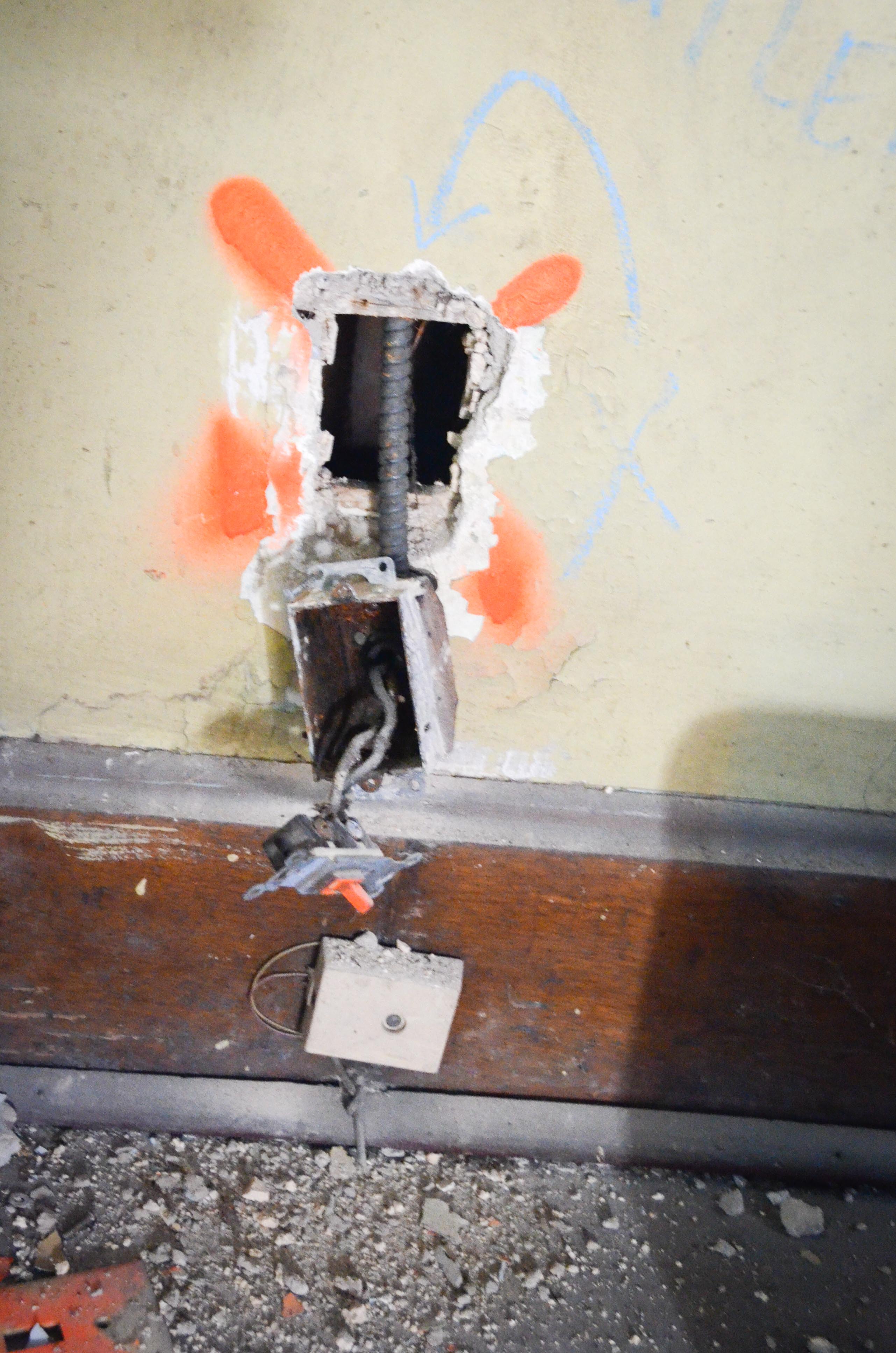 These old receptacles required some serious disassembling. Many were actually plastered in place for who knows what reason. This meant that we had to chisel them out while trying to limit damage to the surrounding plaster and lath. Most had 100 year old screws that were plastered over or painted over and nearly impossible to unscrew without throwing a tantrum and or counting to 10. Sometimes I left walls looking like a wild animal had clawed its way in. The picture below shows some damage but others were far worse. Also, apparently I really have a thing for “X” marking the spot, like twice.