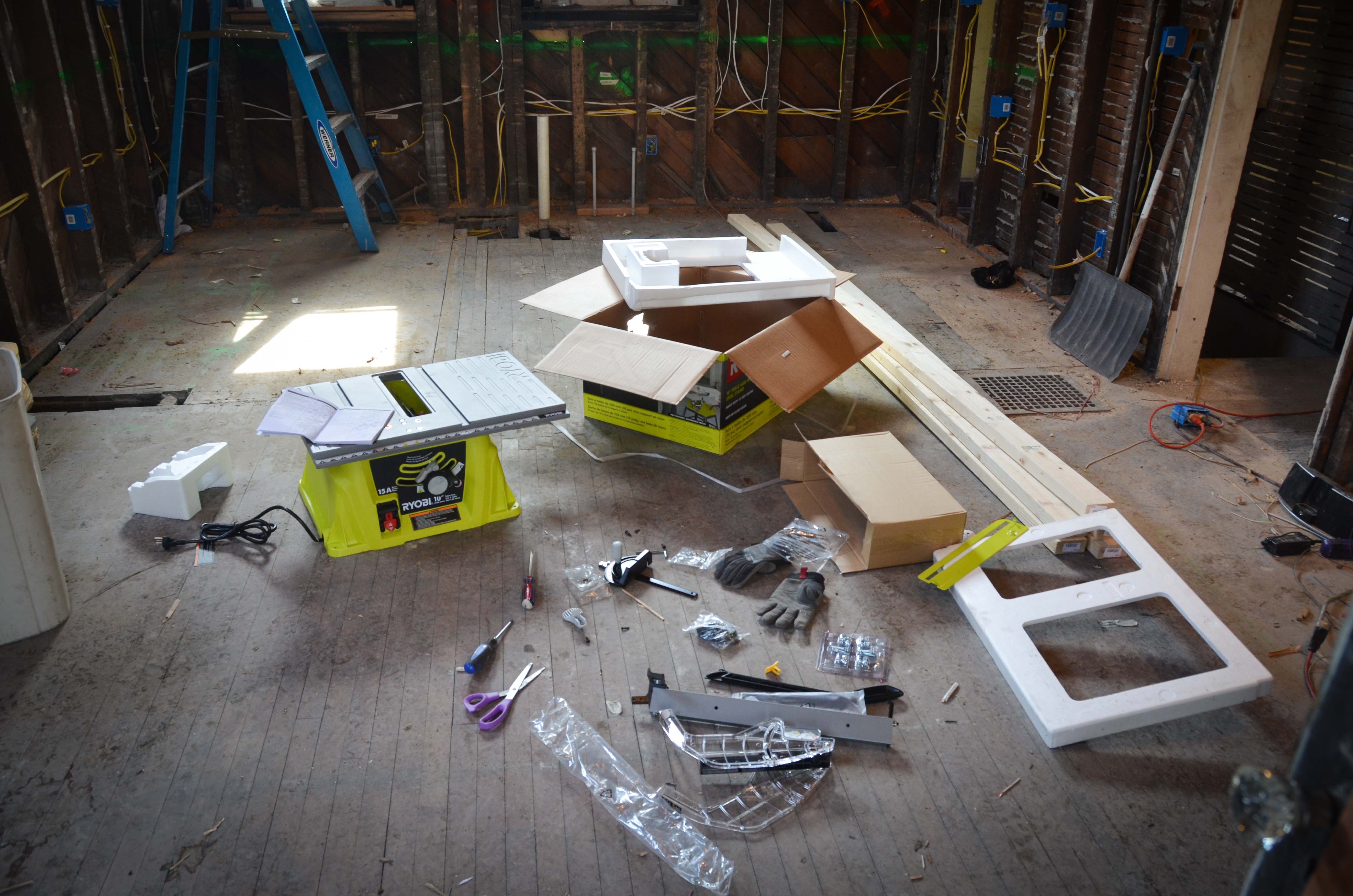 By noon on Saturday I hadn’t even started my project.  Remember that blog post we did on home renovation time sucks?  This weekend was full of them!  For example, here was my Saturday morning:  Get the truck, then go to the hardware store, then clean the kitchen of everything, assemble my table saw (I didn’t even put the legs on it – no time for that!), then finally get work done.