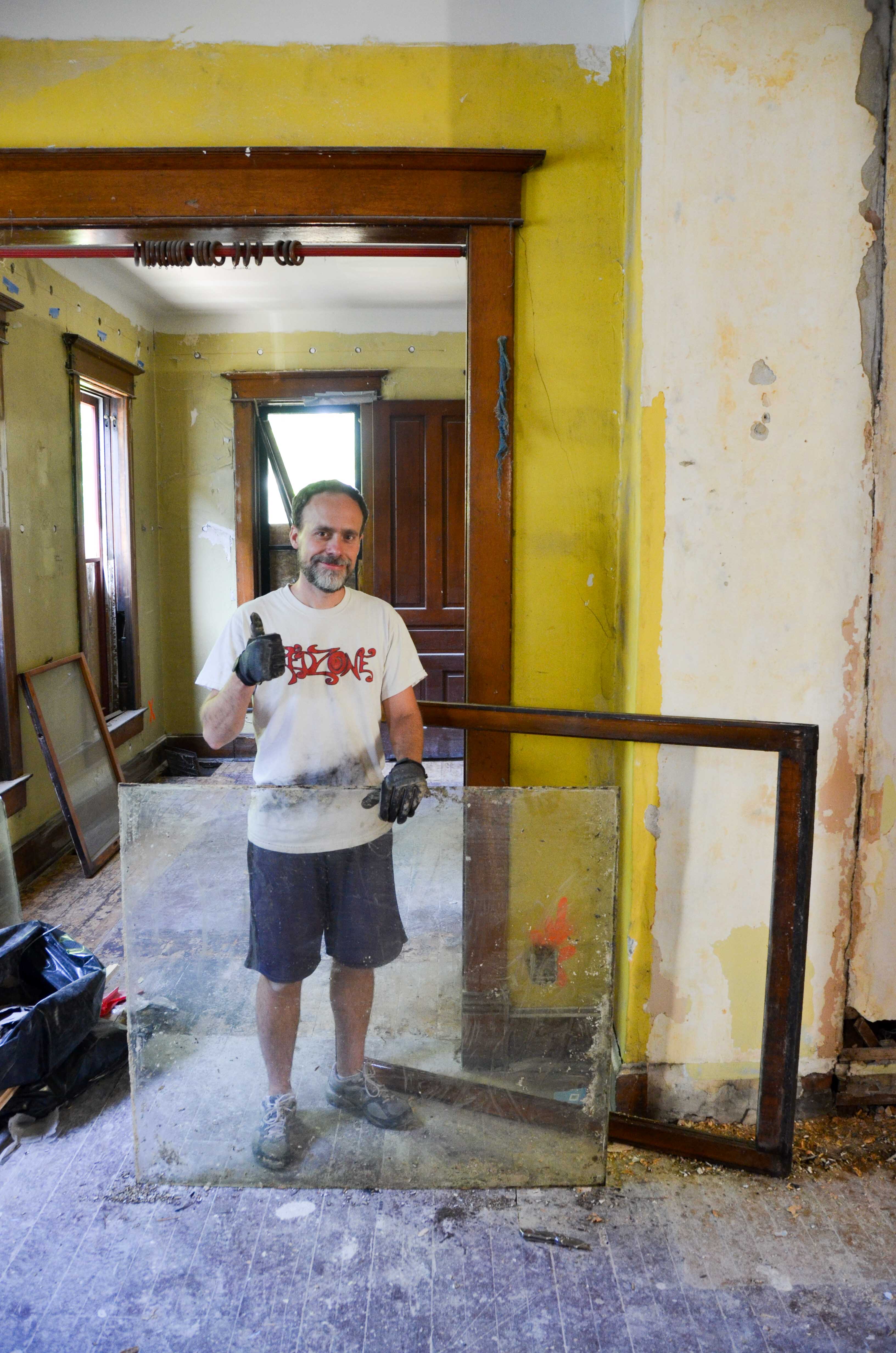 After the sashes were removed I put up the old storm windows and then put the boards back up. This did not please Amy.