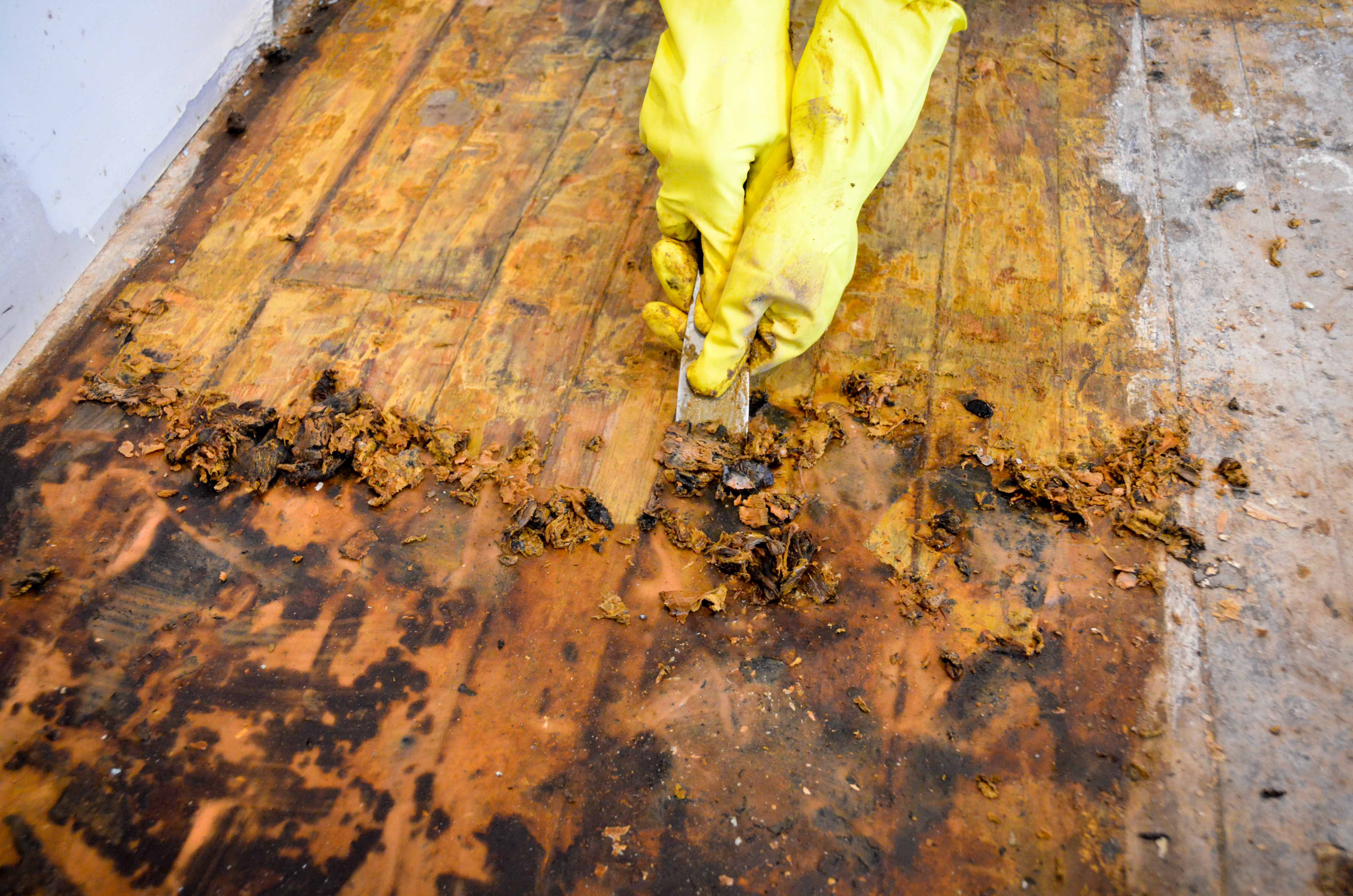 While Joe has been busy continuing window reglazing, door restoration, and plaster repair, I have been chipping away at the floors….literally. I talked a lot about the mastic tar and horse hoof glue removal process in this blog post when I was about half way through the job. Now that job is officially finished and I’m so glad to have it behind me! The last section of the house that needed mastic removal was the kitchen. Here’s a picture of me working on removing tar from the south side of the kitchen.