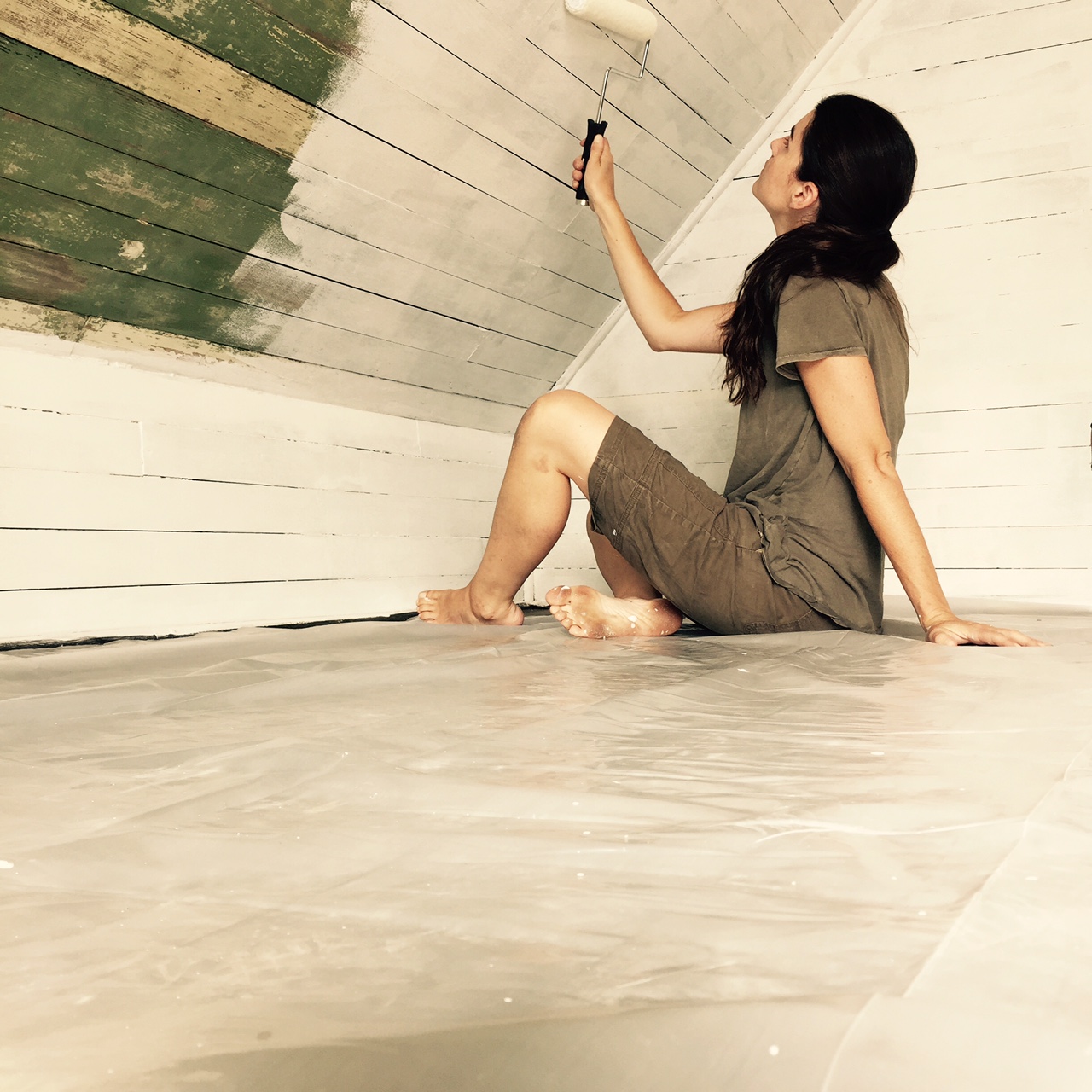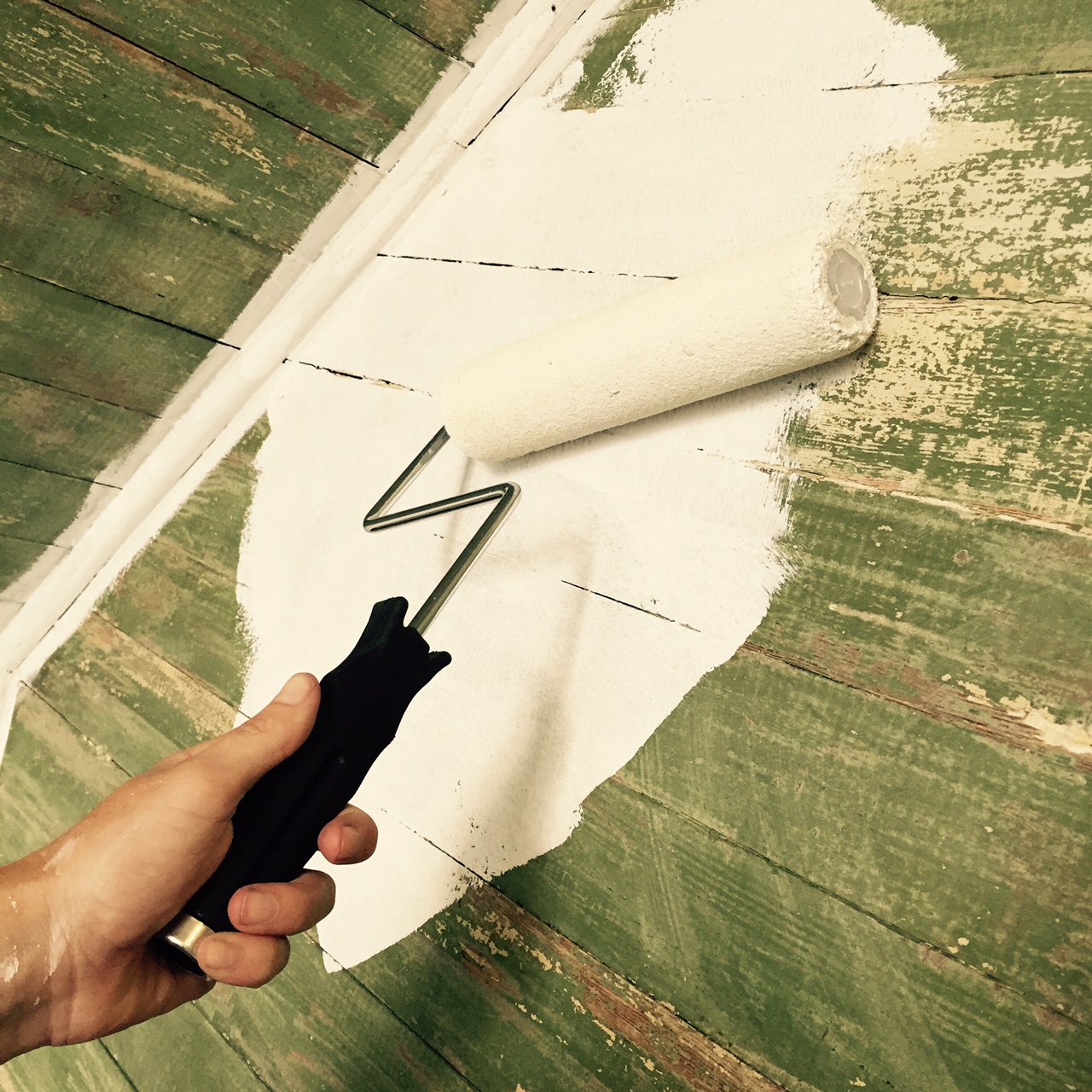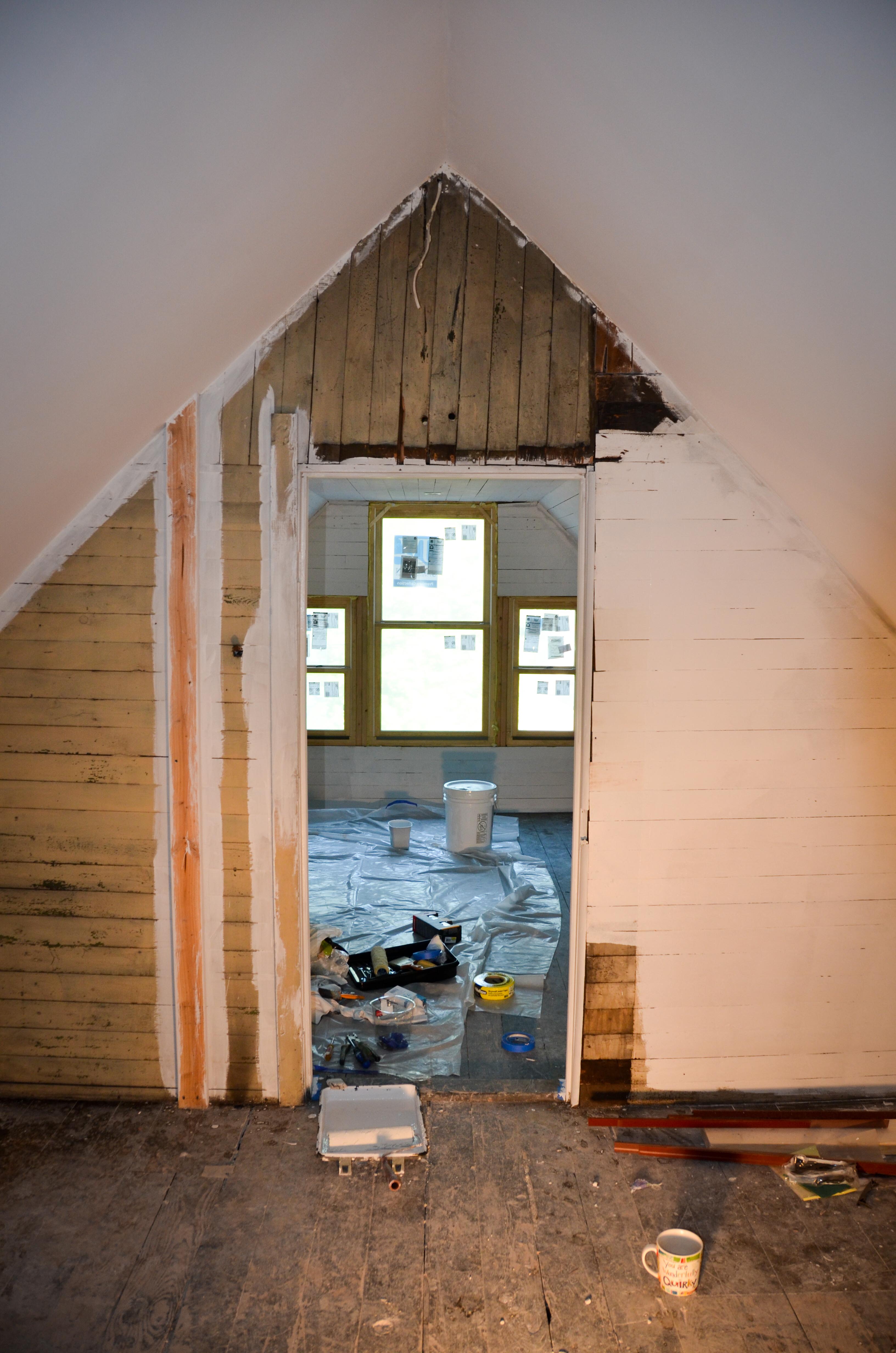 I’m happy to say (after several weeks of work) that the floors are free of all linoleum and adhesives. The floors are patiently awaiting their moment to be refinished, as are we. BUT FIRST we need to get all the walls primed and clean. I’ve been busy priming all of the new drywall as well as Lucy’s clapboard room. It’s felt really great doing a job that has a nice, clean and satisfactory result. Joe had gone in before me and scraped and sanded down all of the chipping paint in Lucy’s room to get a nice smooth finished surface for priming. This resulted in a very rustic green and cream patina. Possibly original milk paint? We we’re a little sad to paint over it. Here is a look at the first layer of primer…