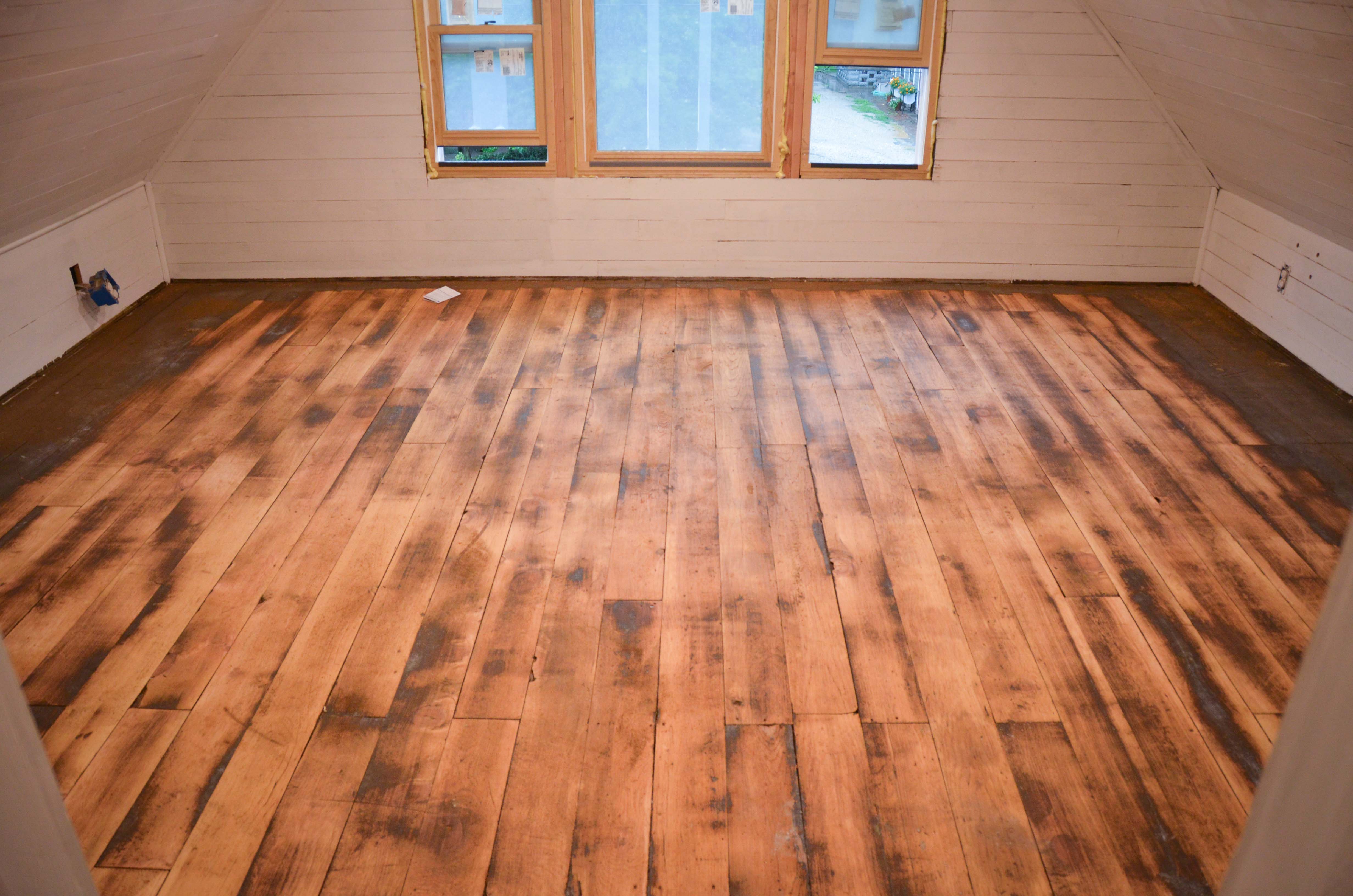 [Edit from Amy: I would just like to say that while Joe is pretending to be the only one sanding the floors that I was there and I did more than sweep….sometimes I held the sanding cord out of the way for Joe. No, wait….I did other things too! My big job for the day was sanding the perimeter of the floors with the edger. This is a smaller version of the big sander but don’t be fooled. It is not the equivalent of the wimpy girl gun. This thing was heavy, difficult to control, and the darn sawdust bag kept shooting off behind me. And, I can’t be too sure but I may or may not have used foul language. ] I firmly believe that many DIYers tend to overdo things rather than the opposite.  That’s because we are working on our own homes.  We want it to be right, not quick.  It is probably overkill, but even after sanding the first floor with a 20 grit I felt like it needed another pass (something the guy at the rental place suggested I might do).  So I did it all again.  I did that on all four areas we sanded today.  Then I did the 36 grit – twice!  But now it looks great.  These floors have never been sanded, they are uneven, and have 100 years of dirt and soot imbedded deep into their pores.  I figure it’s going to take a little elbow grease to get them looking good.  Here is what one spot looked like after the first pass of the 20 grit…