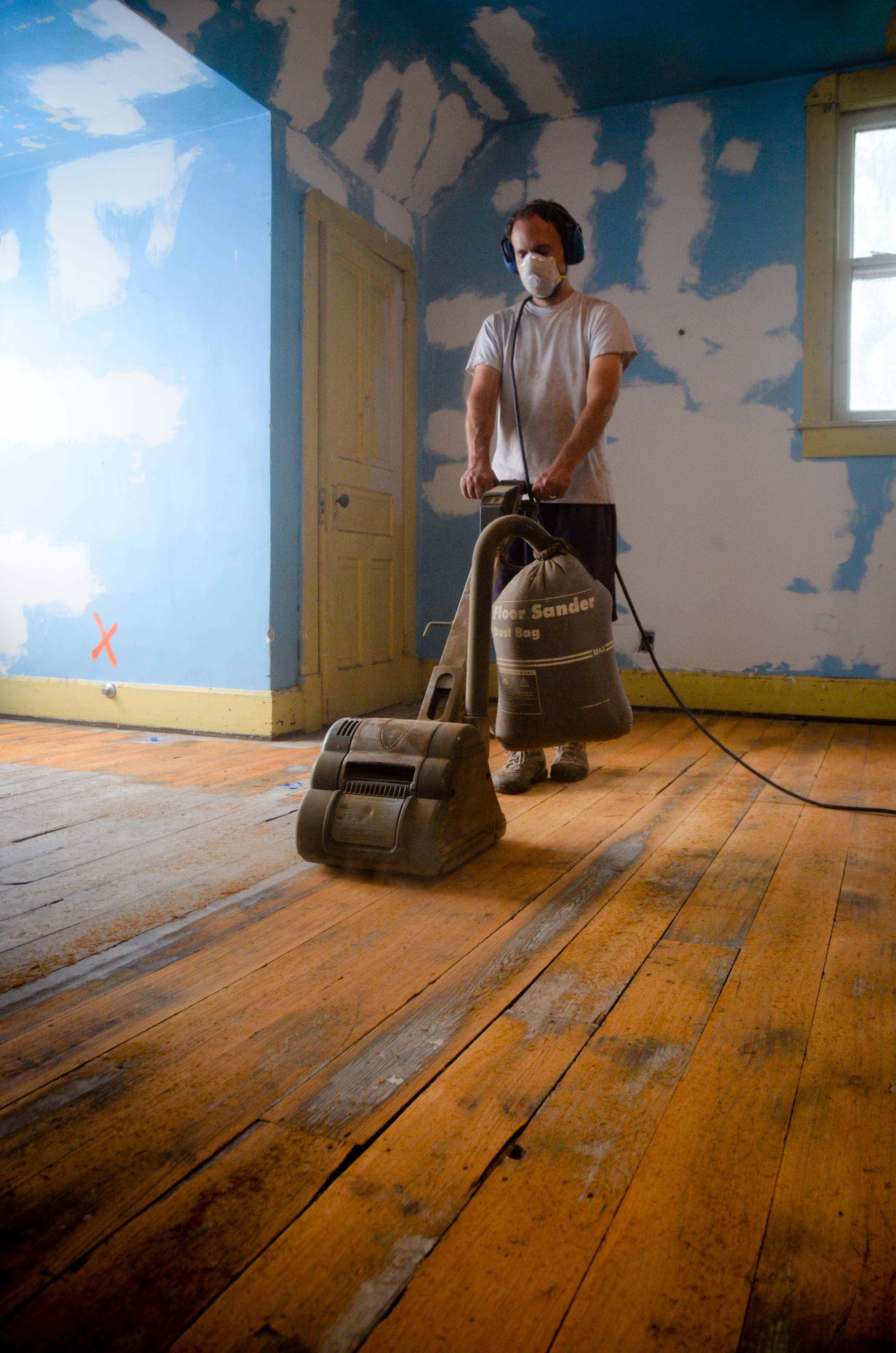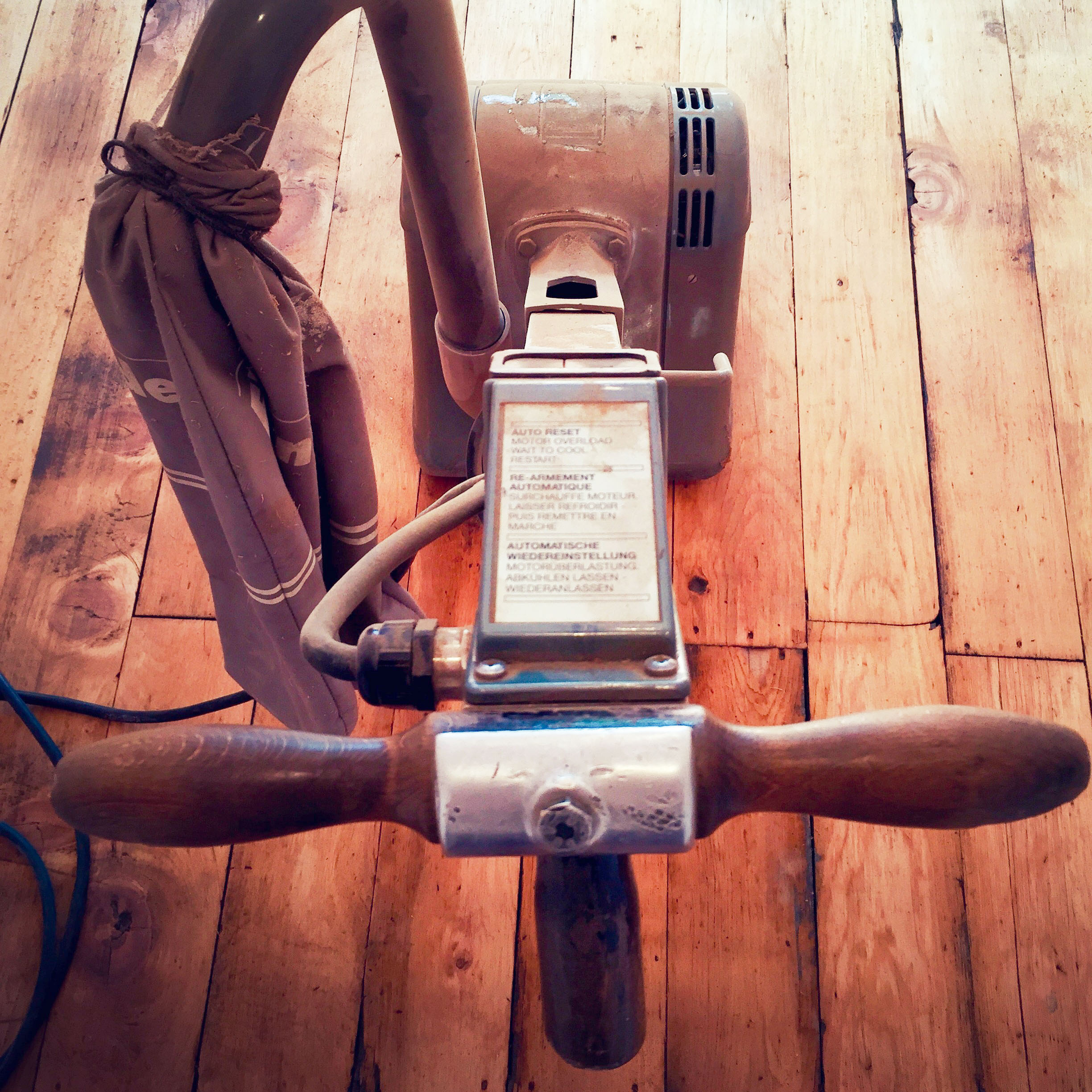 Sanding and refinishing the floors was a job that had been looming at the very end of the first stage of our home renovation.  It marks the end of major mechanical, electrical, plumbing, and structural jobs and also acts as a bridge to the next stage of our project.  I woke up this morning relatively confident I had done all I could do to prepare for this next endeavor, but I couldn’t help but think about all the things that could go wrong….  beginning with picking up the equipment.  In my mind, for whatever reason, I felt like the guys at the rental place were going to point and laugh at me, or even worse, refuse to give me the equipment.  I know – it’s ridiculous. I am a full-fledged home rehabber.  I am now sufficiently dirty and seasoned.  I seized the opportunity to skip the big box stores and happily support a local rental place on the near eastside just down the street from our house.  The guys turned out to be extremely friendly, helpful without being condescending, and set me up with good information about the specific sanders I was renting. [Edit from Amy: See I told you it would be fine.] My first impression of the drum sander?  It’s so vintage and cool-looking!  [Edit from Amy: It’s all round and cute like a grey little storm cloud.] Also, it’s a little smaller than I expected, but literally weighs a hundred pounds.  So small and unassuming.