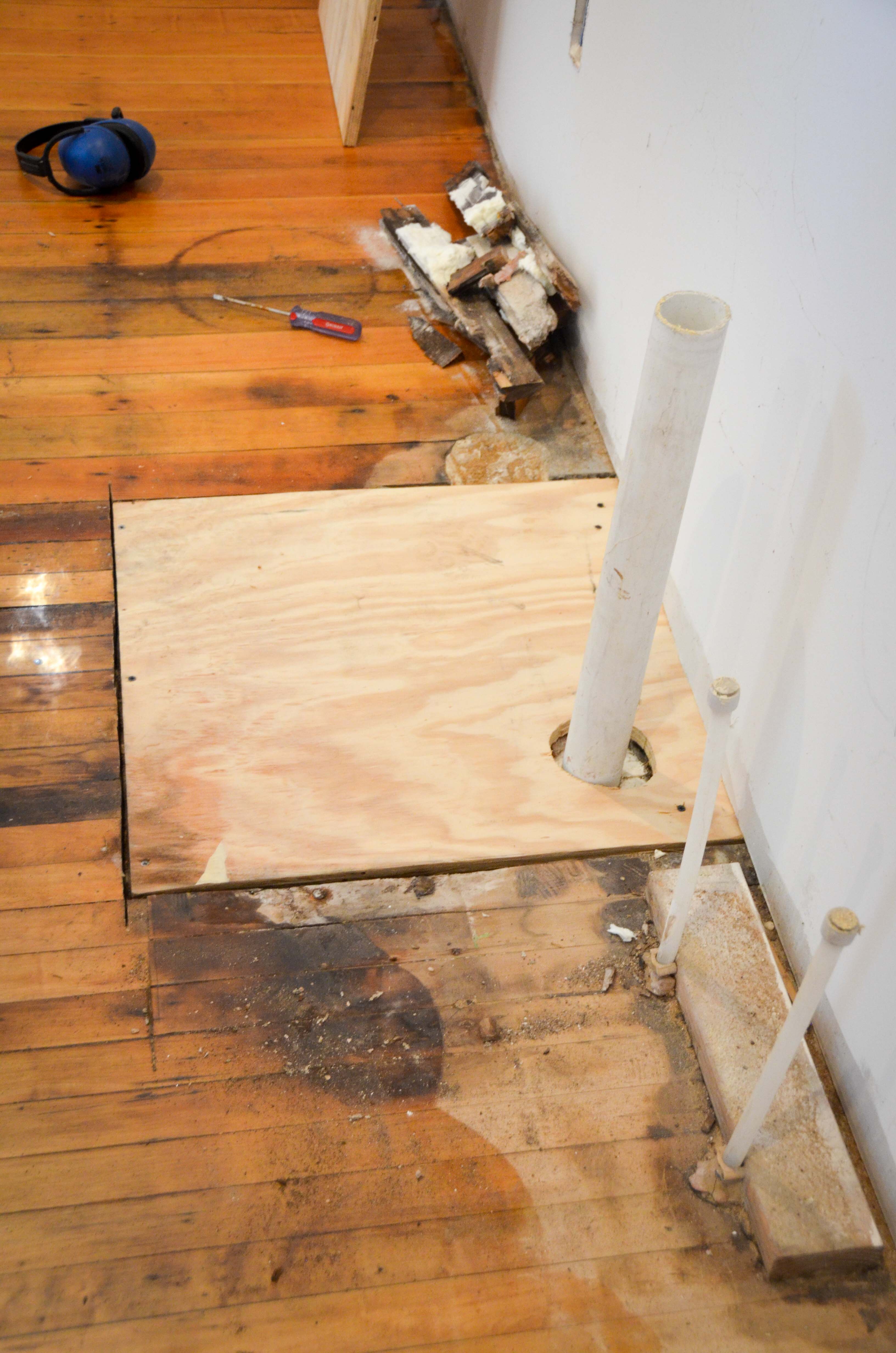 This needs to be cleaned, sanded, repaired, and painted before the plumbers can finish the installation job.