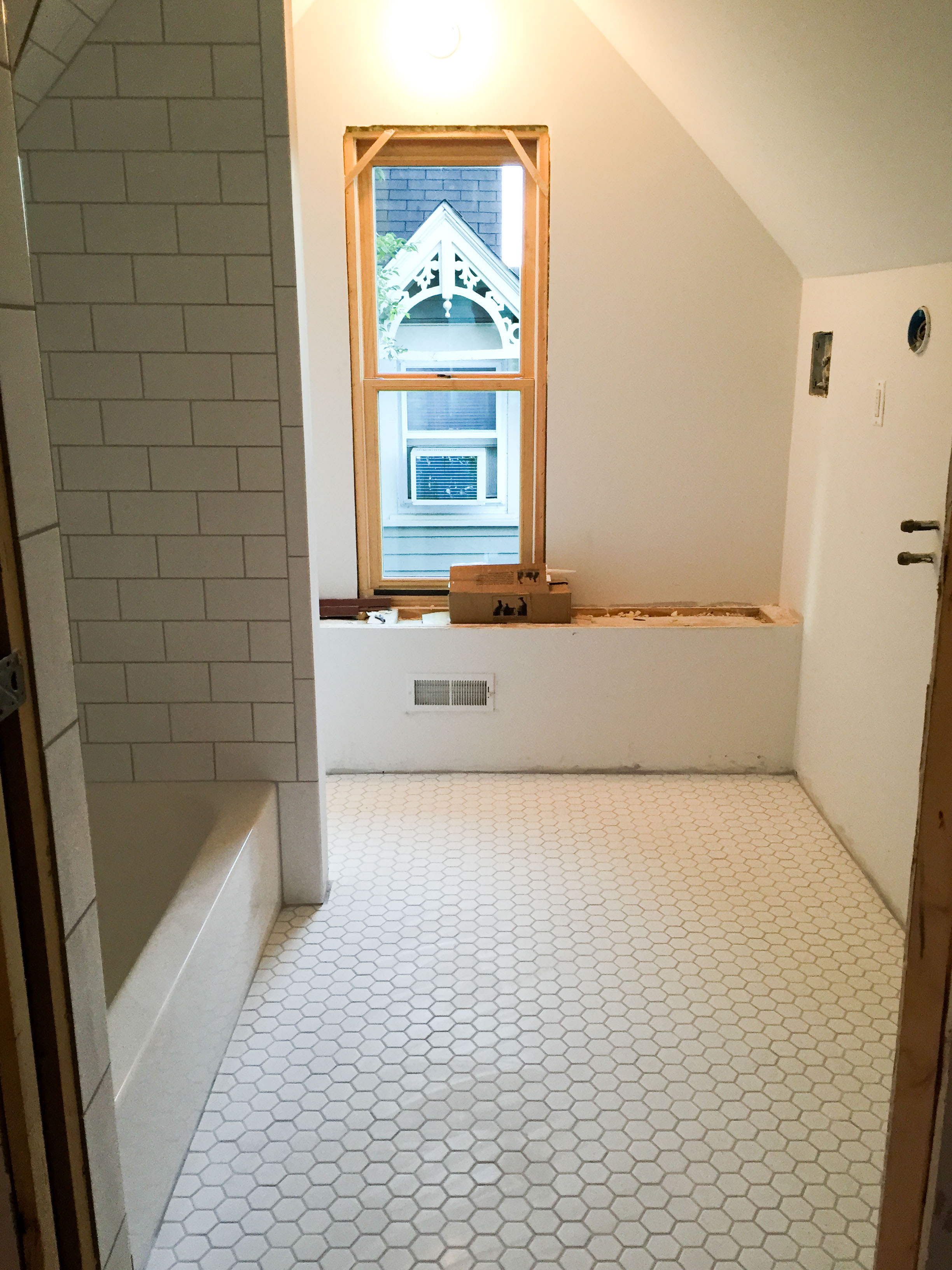 The bathroom tiling was a job that we had always intended to do ourselves. We have previous experience with tiling and by this point in our rehab we were pretty much ready to be done with contractors. BUT, the reality of a looming deadline and the end of our summer “free time” meant reconsidering this plan. Also, we were very blessed with sympathetic family members who offered to help by paying for the tile to be done. This was obviously a tremendous boost for us and we were so thankful because the renovation train was starting to lose just a little steam. The tile guys were able to fit us in on short notice and were great to work with. We will wait to do a full reveal of the bathrooms until they are more complete, but here is a special sneak peak of the upstairs bathroom…