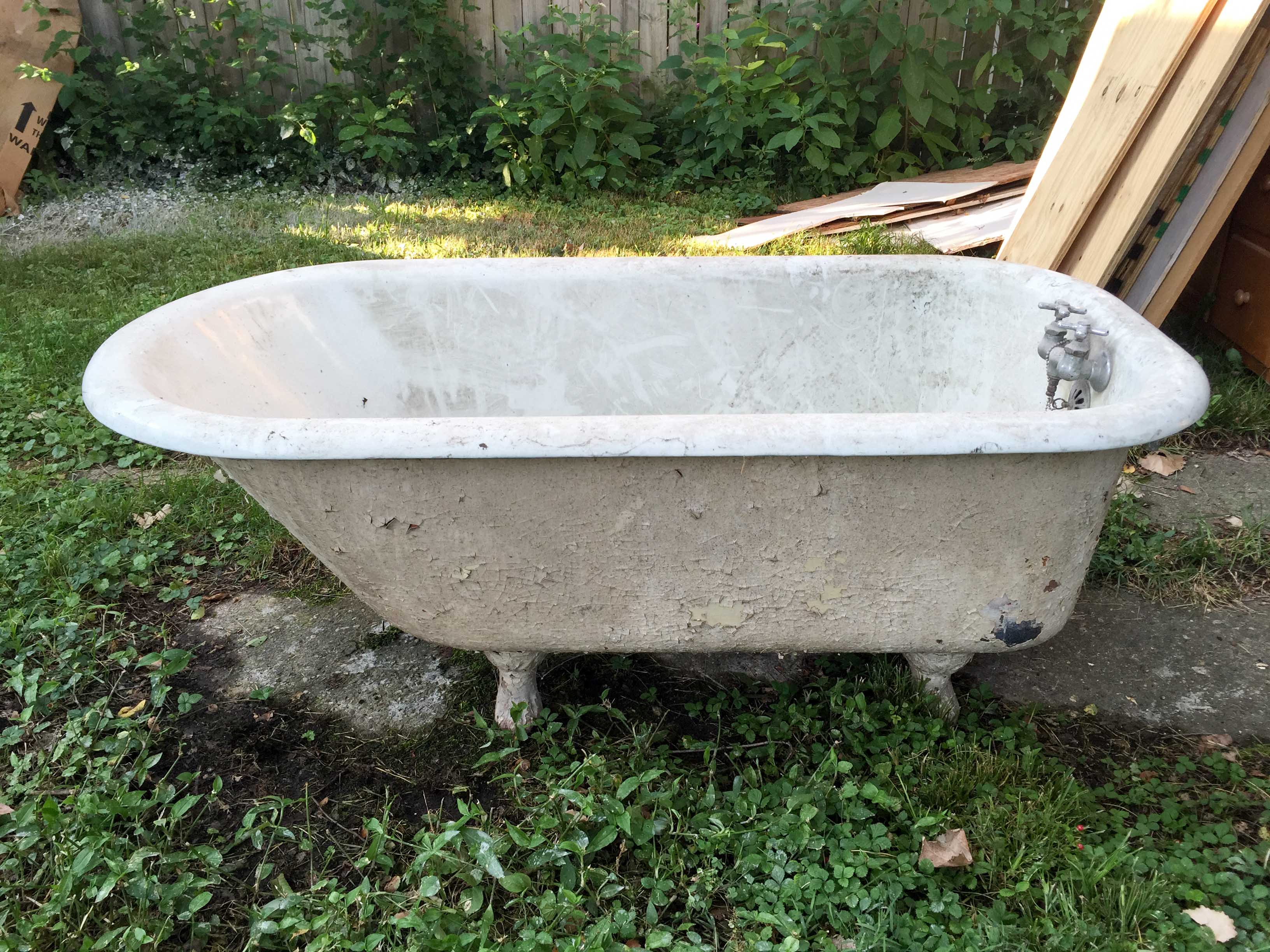 After the tile work was complete we had very little time to add beadboard and other small things which had to be done before the plumbers could start. One project that we had been putting off was the rehab of the original clawfoot tub. That project will be a separate post, but here is a picture to give you an idea of what Amy was facing…