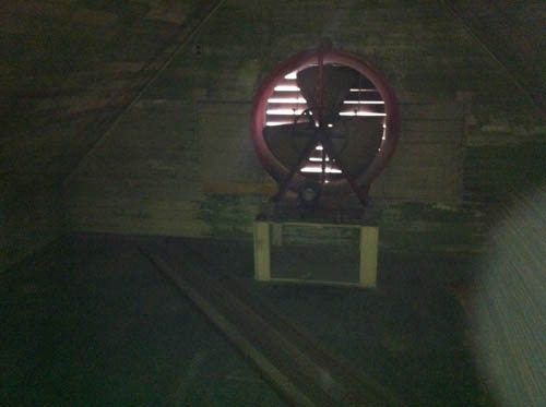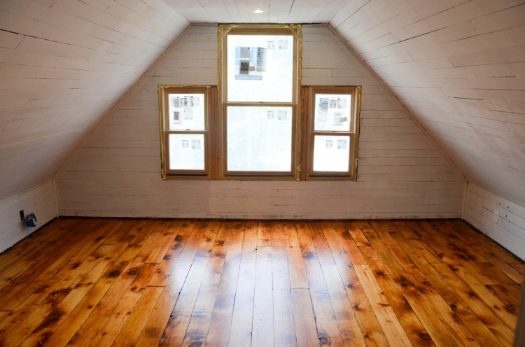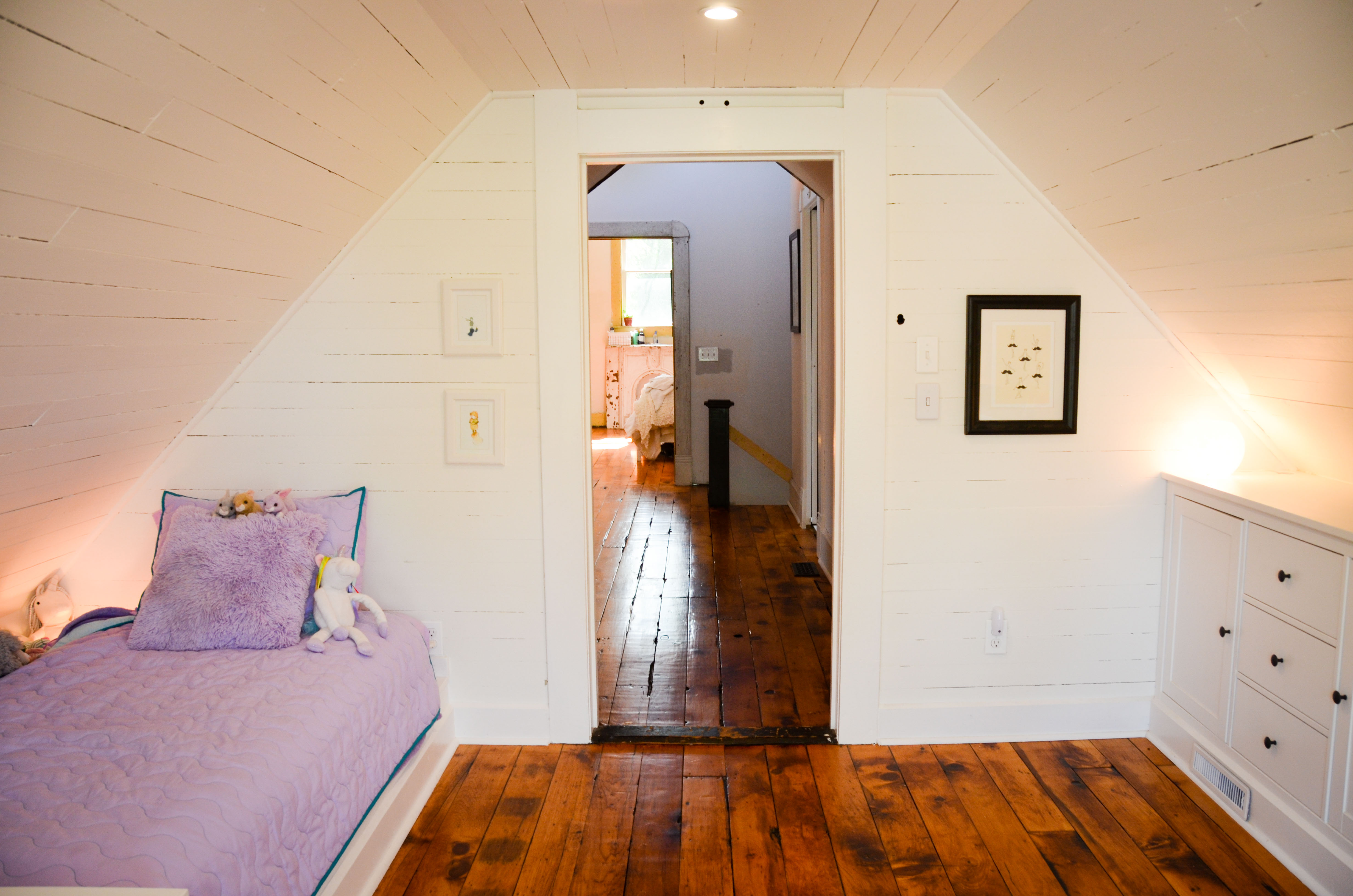 It was dark, scary, and we weren’t really sure what might be lurking in the corners. The most dominating feature of the room was this gigantic fan that was used to pull hot air out of the house. Lucy’s room remained in this condition for many months as we worked on much more pressing areas of the house. When we did finally have time to turn our attention to this room one of first jobs involved removing this fan and all the siding on the front gable.