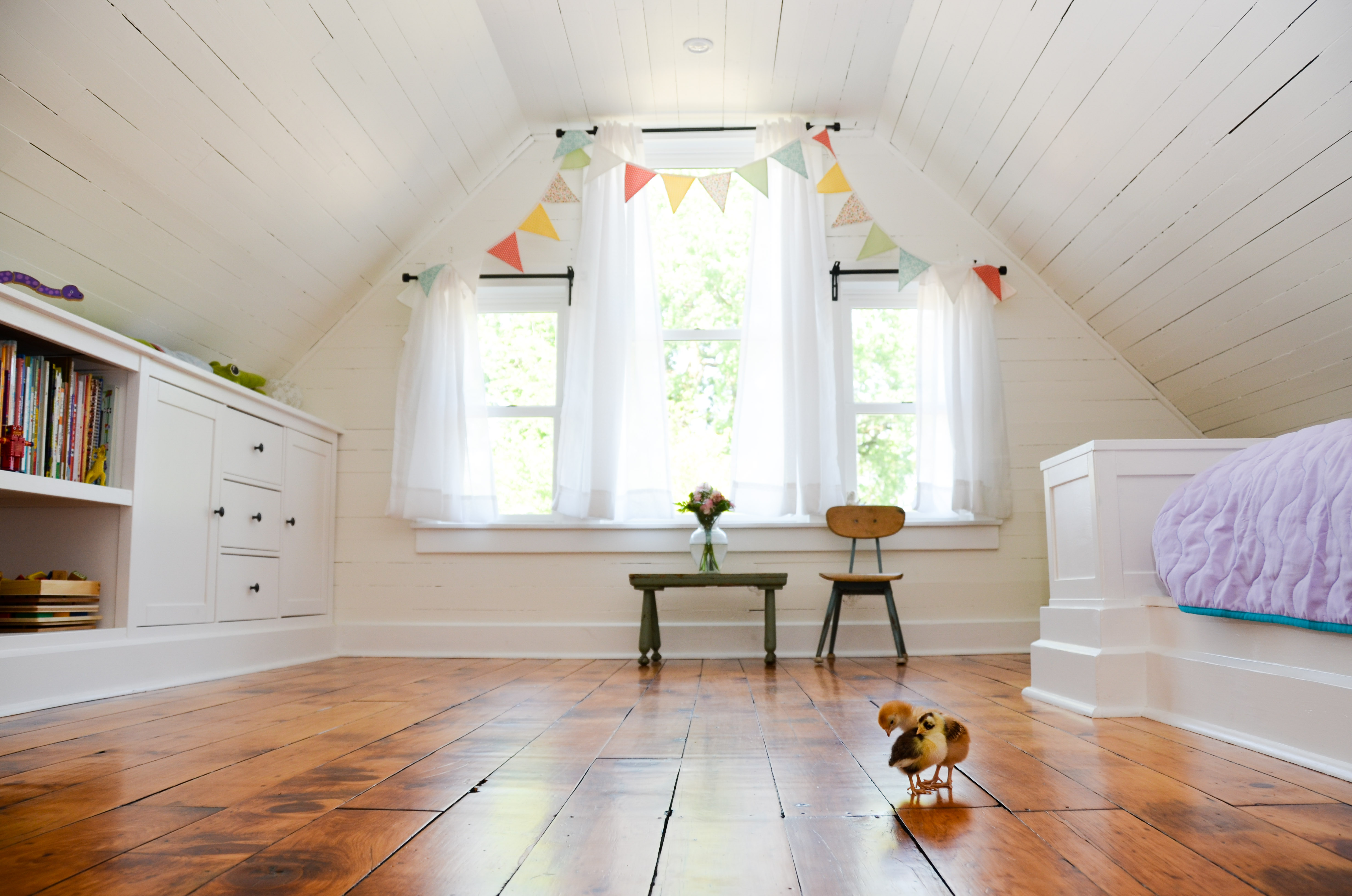 Oh… We have been raising a few baby chicks the past couple weeks. They currently reside in the clawfoot tub of the first floor bathroom, but we took them on a little field trip to explore Lucy’s room.