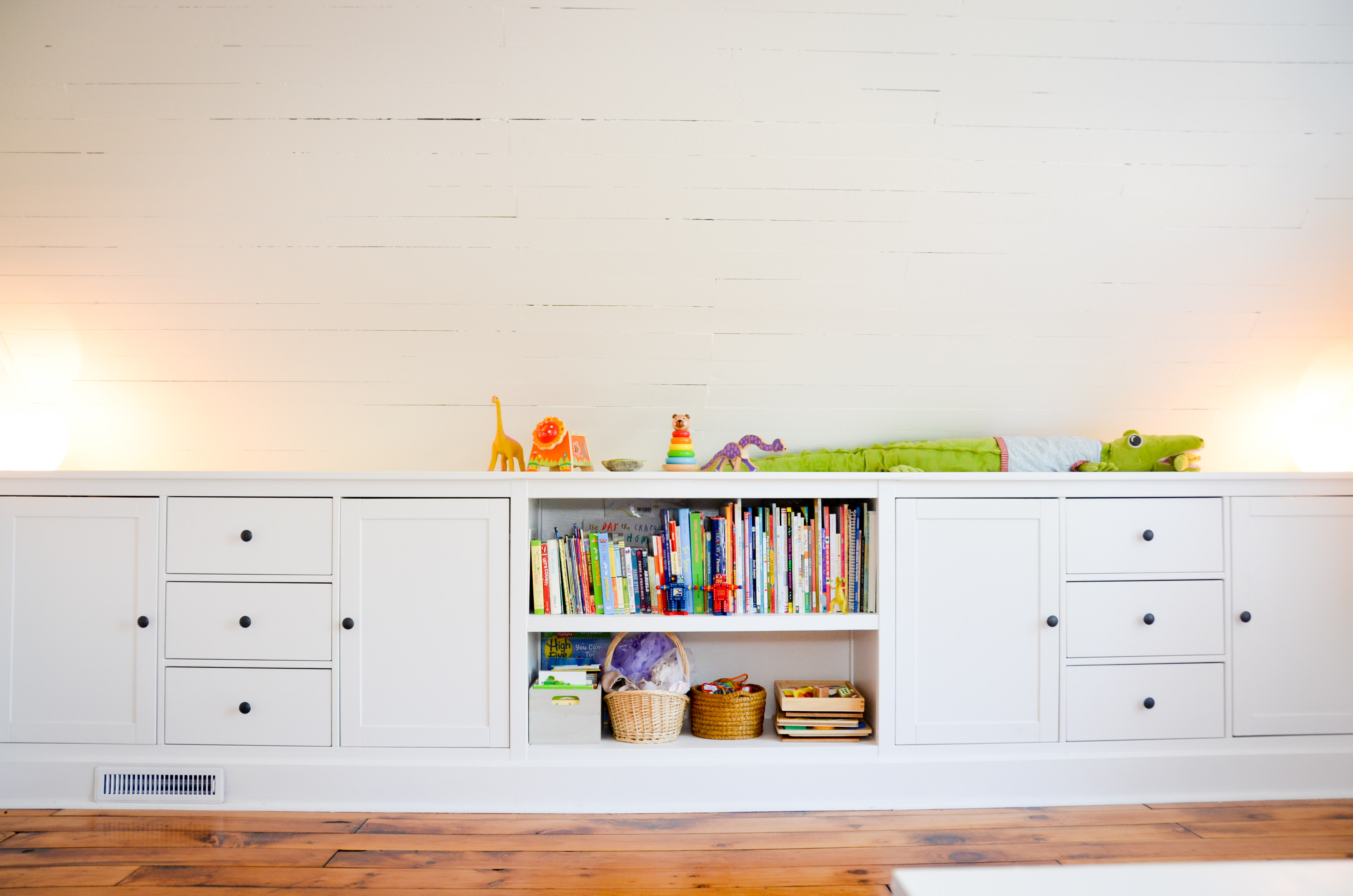 Winter break finally allowed time to do some fun, creative projects to make this room a little more functional. I used IKEA furniture to create built-in dressers for clothes and toy storage. The furniture is solid wood, so I was able to sand them and eventually paint them to match the trim and complete the built-in look. The dressers were augmented slightly to fit flush with the ceiling and walls. I also added a shelving unit in between and then finished it all with trim.